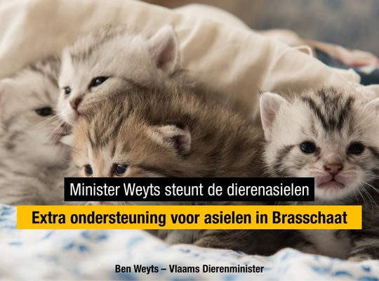 Vlaams Dierenminister Ben Weyts geeft € 9.469 financiële steun aan dierenasielen in Brasschaat. Tot voor amper een paar jaar geleden kregen dierenasielen geen enkele structurele steun vanuit de overheid, maar nu maakt Weyts in totaal € 775.000 vrij voor de
